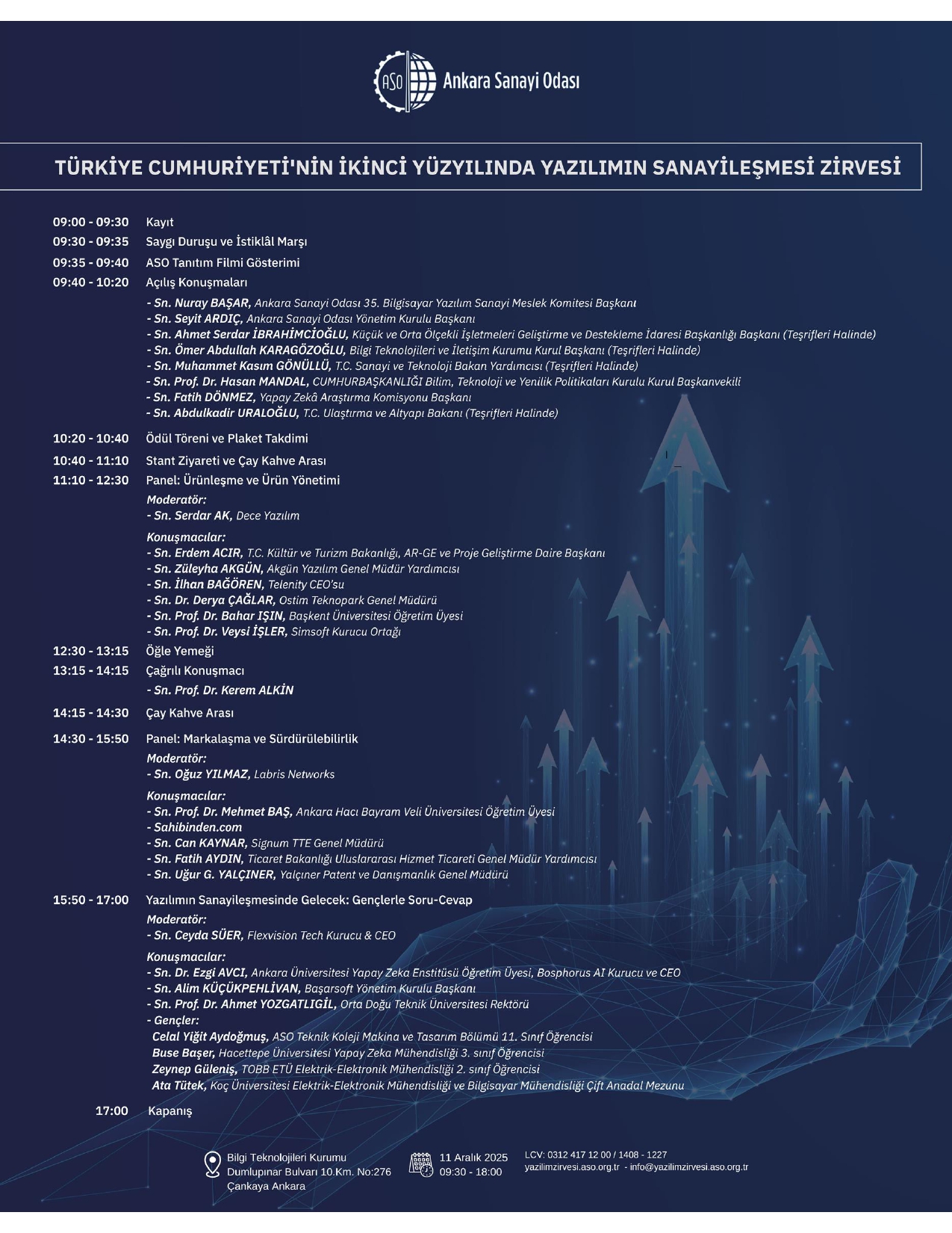 Ankara Sanayi Odasının "Türkiye Cumhuriyeti'nin İkinci Yüzyılında Yazılımın Sanayileşmesi Zirvesi" hakkındaki duyuru metni aşağıda belirtilmiştir.