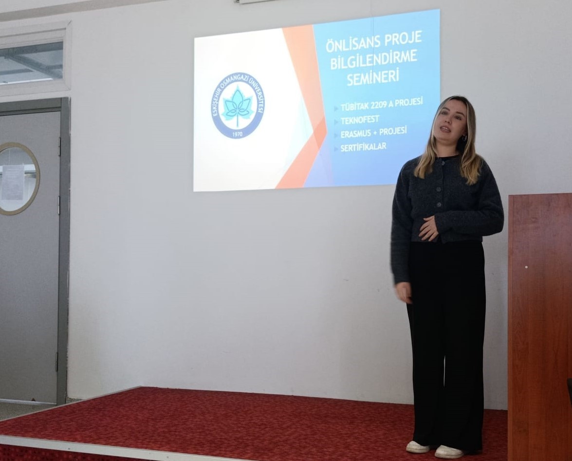 Bilgilendirme toplantısında konuşan Meslek Yüksekokulumuz Müdürü Sn. Prof. Dr. Hilal DEMİR KIVRAK TÜBİTAK tarafından desteklenen projelere katılım sağlayan öğrenciler ile danışmanlık deneyimlerini paylaşmış ve öğrencilerimize danışmanlık konusunda gönülden destek olabileceği ifade etmiştir. Ayrıca Eskişehir Teknoloji Geliştirme Bölgesi’nde (ETGB) çalışmaları bulunan Prof. Dr. Pınar AYTAR ÇELİK öğrencilerimize ETGB'de yapılan çalışmalarını anlatmış ve danışmanlık desteği vermeye hazır olduğunu belirtmiştir.